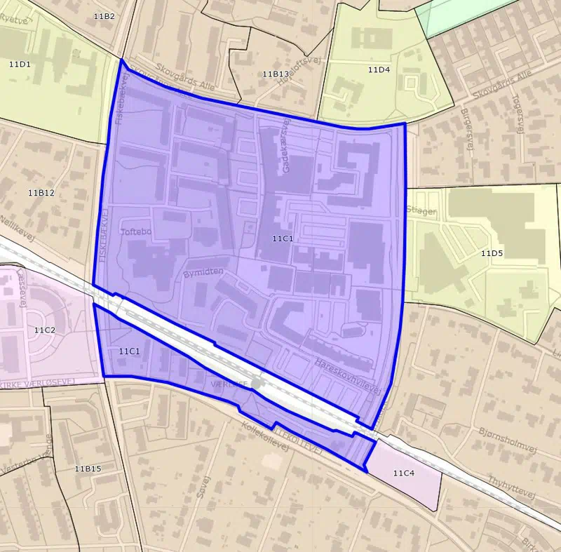 Afgrænsning af kommuneplanramme 11C1 – Værløse Bymidte er vist med blå.