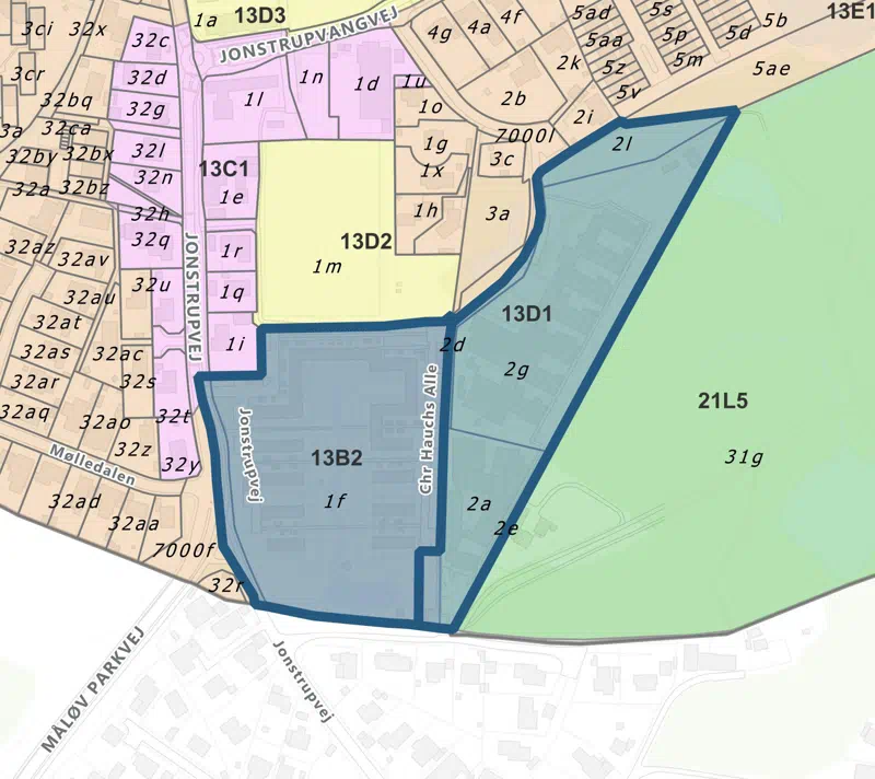 Kortet viser, med blå afgrænsning, den nye afgrænsning af kommuneplanrammerne 13D1- Jonstrupvang og 13B2 – Jonstruphusene ved Tillæg 4 til Kommuneplan 2025.