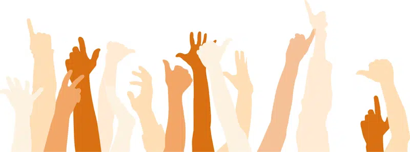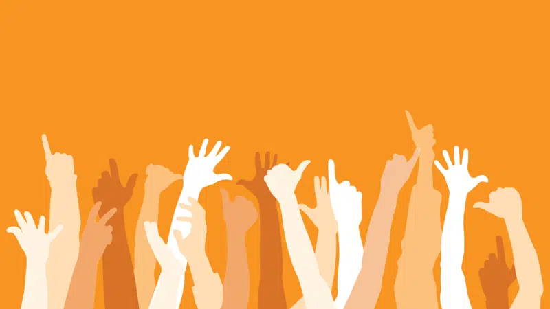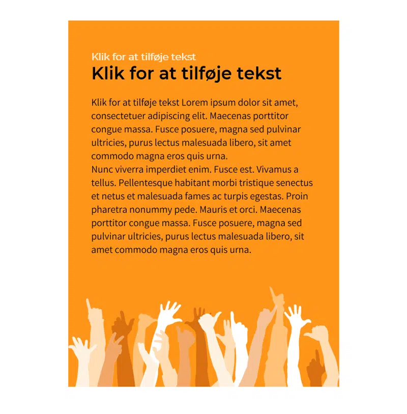 Det markeres med den orange grundfarve og et grafisk element med en stribe hænder, der er reserveret til indhold, hvor modtagerne kan få indflydelse på udviklingen af kommunen.